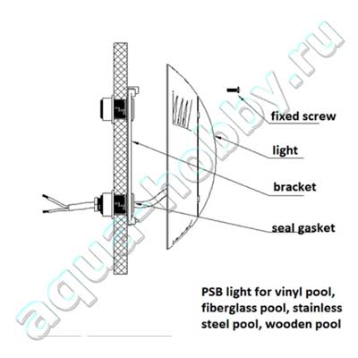 Прожектор для бассейнов, установка на борт бассейна. Прожекторная лампа позволяет устанавливать 19 световых эффектов. Управление программами осуществляется с помощью включения/выключения питания или Д/У пульта (не входит в комплект).