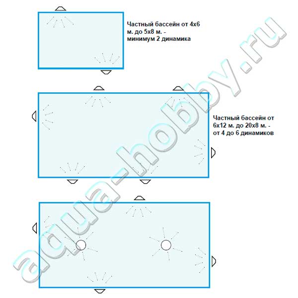 Частный бассейн от 4 х 6 м. до 5 х 8 м. - минимум 2 штуки (схема на рисунке);